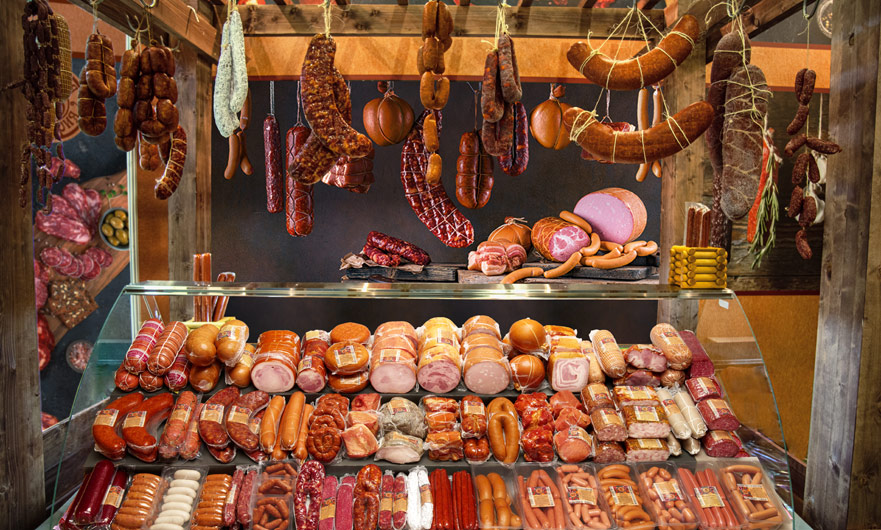 Гастрономическая витрина создана в рамках тренда «мясная лавка». Современное комплексное решение рекламного оформления прилавка. Специально подобранный ассортимент сопровождается консультацией продавца — мясного сомелье. Витрину украшают муляжи колбас, сосисок, деликатесов, которые буквально манят покупателей.